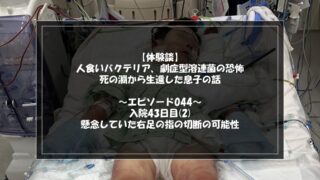 人食いバクテリアと呼ばれている劇症型溶連菌に息子が感染し、回復するまでの実際の体験談です。改めて足の指の切断の可能性を医師から伝えられた入院43日目後半の様子をまとめました。当時の私がそうだったように、人食いバクテリア感染者のご家族は回復した例を探していると思います。そんな方々が少しでも希望を持てること願い、息子の了承を得て公開することにしました。